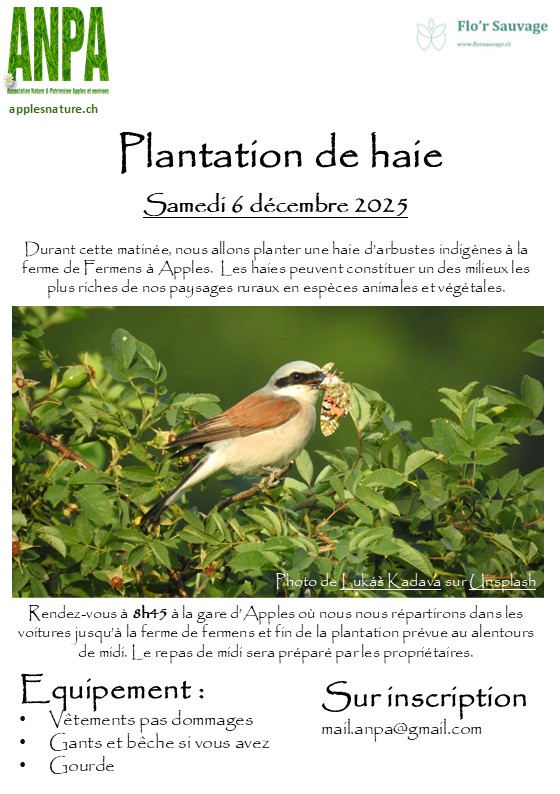 Durant cette matinée, nous allons planter une haie d’arbustes indigènes à la ferme de Fermens à Apples. Les haies peuvent constituer un des milieux les plus riches de nos paysages ruraux en espèces animales et végétales.